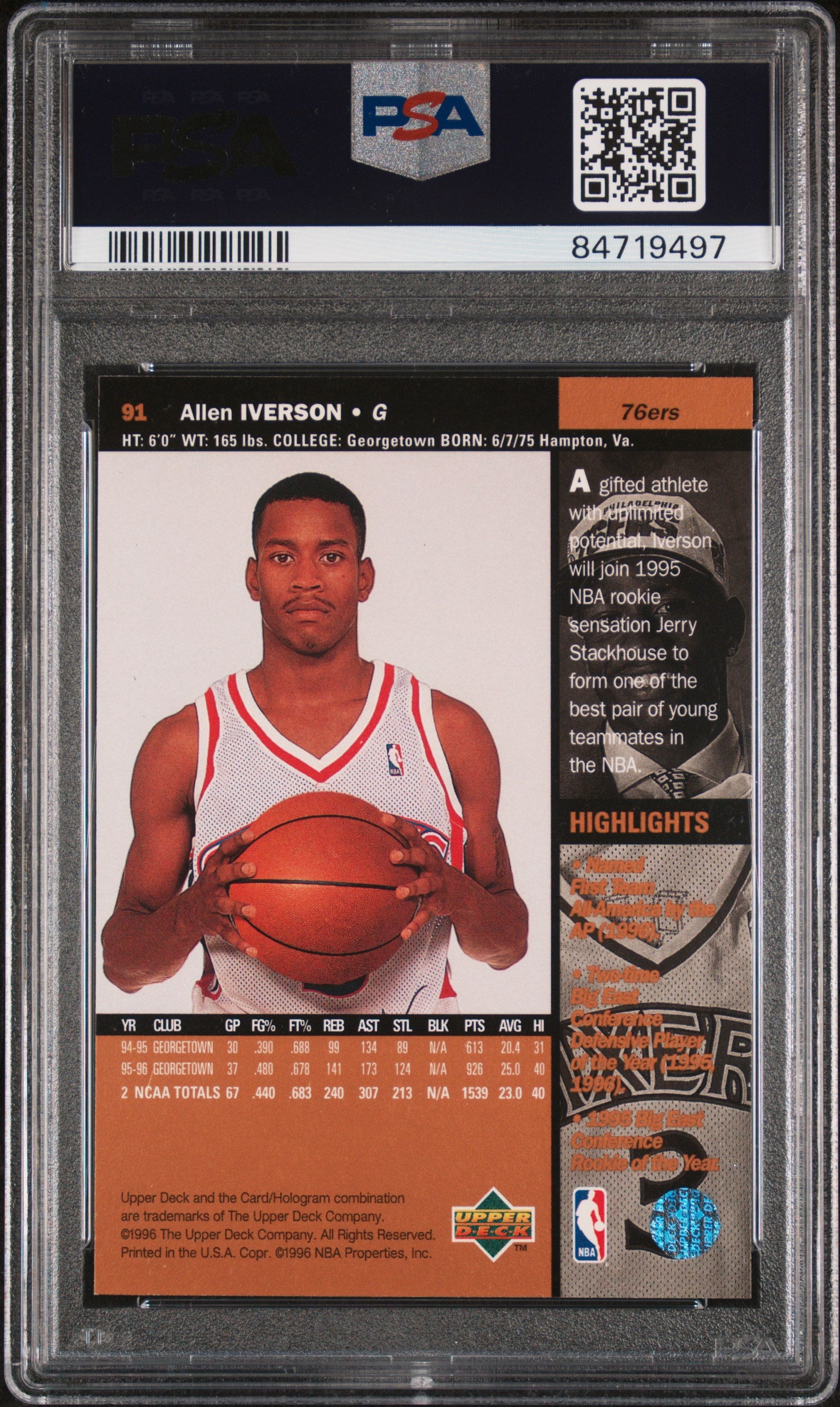 1996 Upper Deck - Allen Iverson - Rookie Card #91 - PSA Graded Card