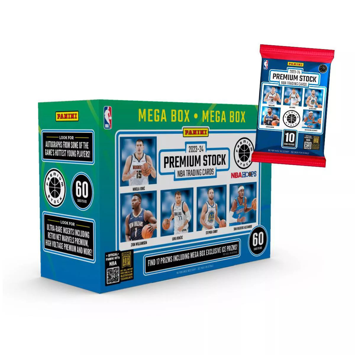 Panini presents the 2023-24 NBA Premium Stock Basketball Trading Card Mega Box. Each box contains 6 packs with 10 cards per pack. Look for autographs from some of the Game's Hottest Young Players! Look for Ultra-Rare Inserts including Retro Net Marvels Premium and More! Look for Prizms and Exclusive Mega Box Ice Prizms!