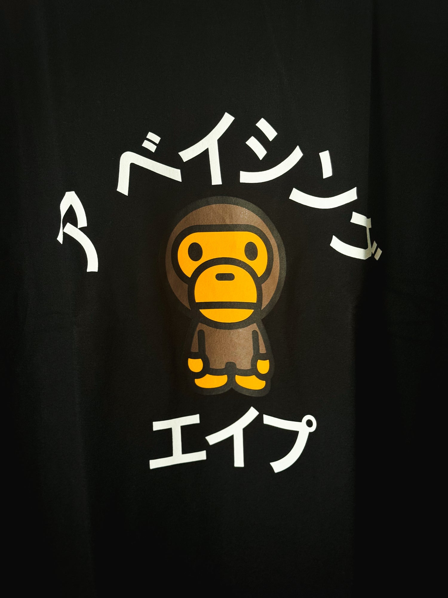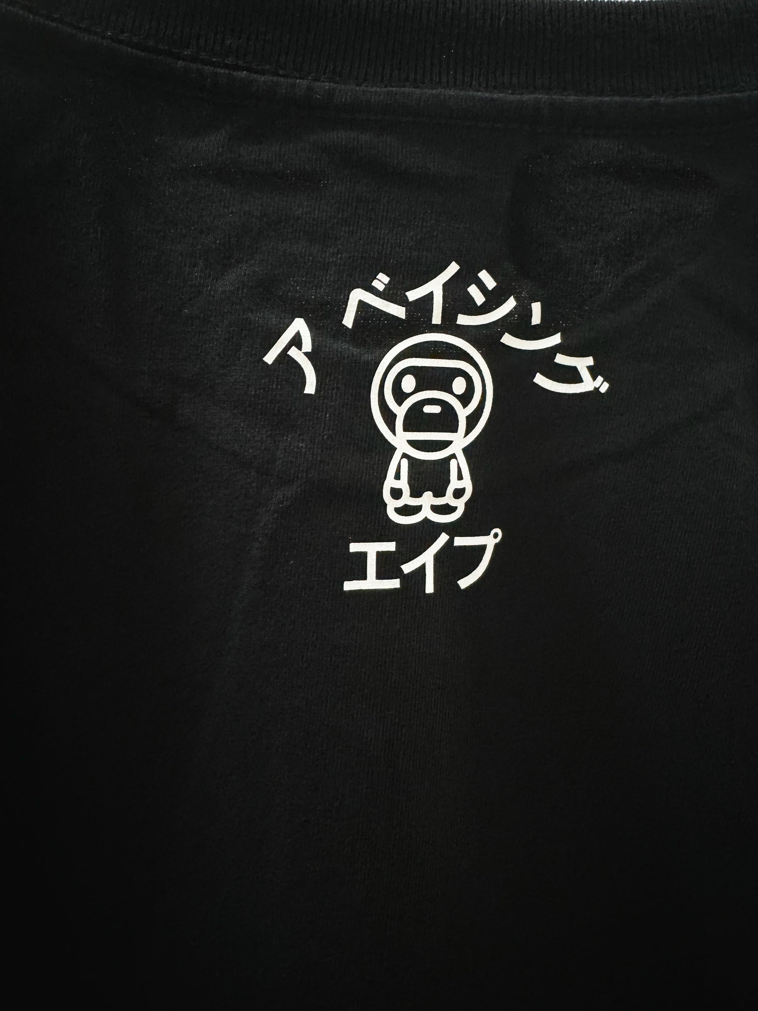 Purchased from the BAPE Kyoto store. The shirt reads "A Bathing Ape" in Japanese. This fits like a US X-Large. If you like a looser fit, this would fit a US Large as well.