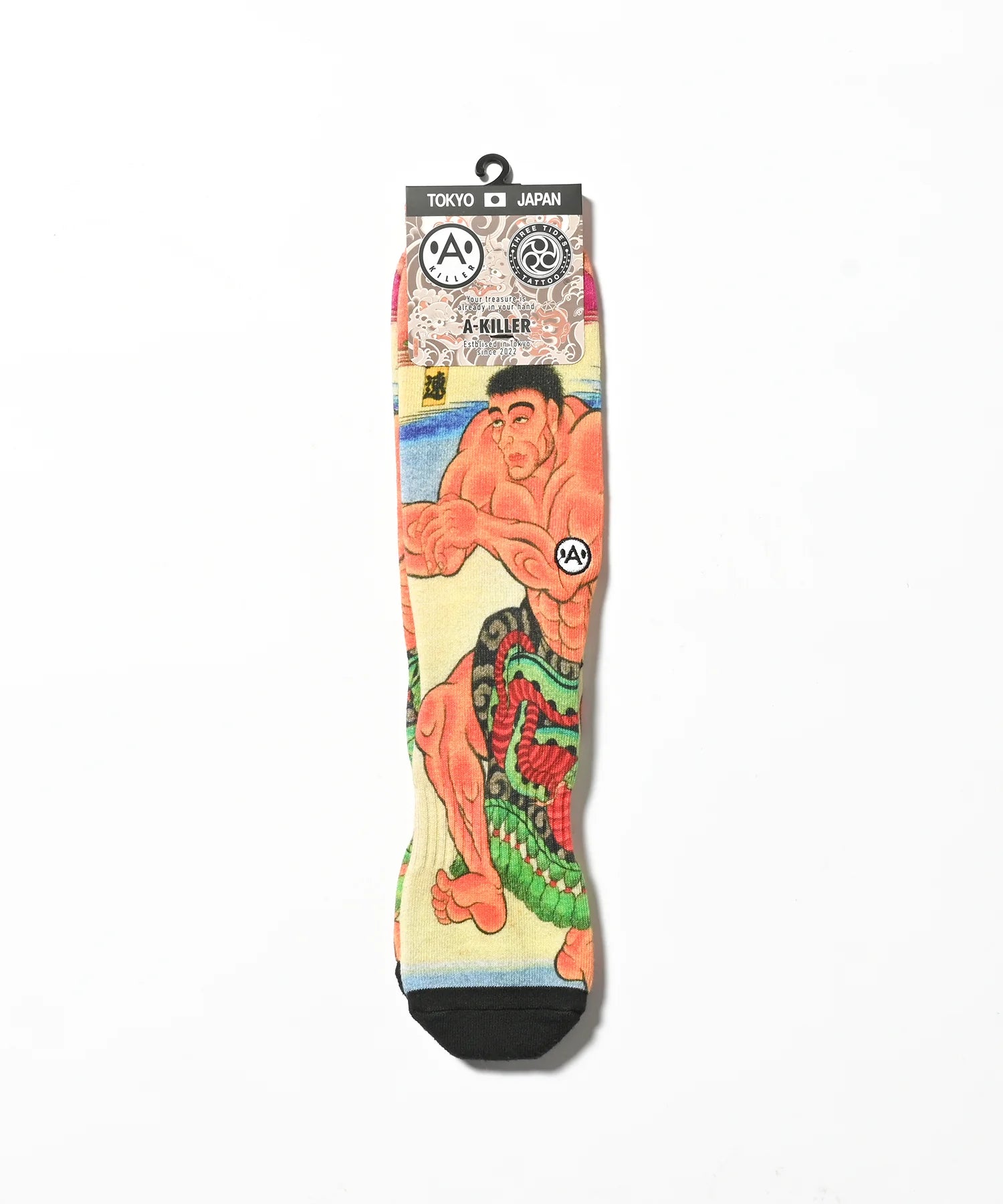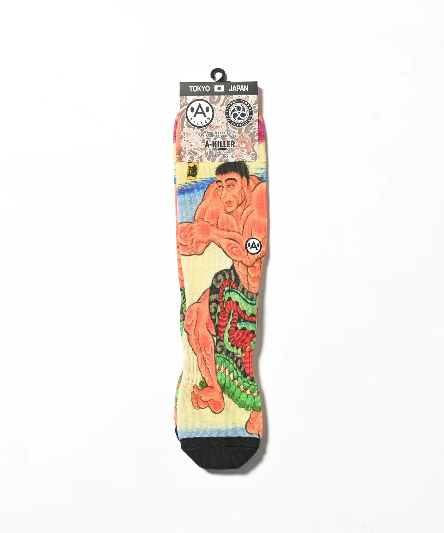 These socks are printed all over with ukiyo-e designs of characters from "Grappler Baki, Baki-Dou", drawn by tattoo artist "Mitsutomo Horihiro" who is also known as the ukiyo-e artist "Edo Horihiro", and entitled "Baki the Twelve Heavenly Generals"