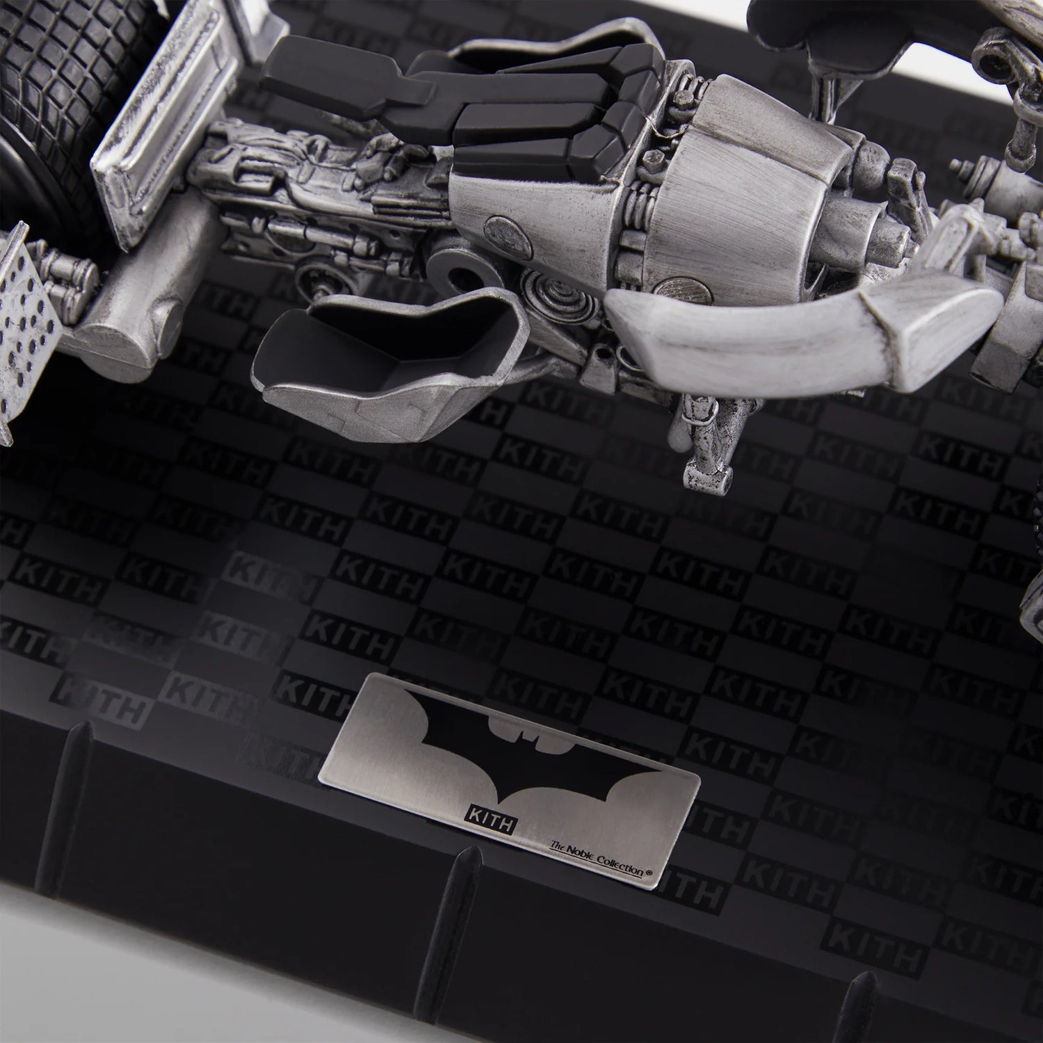 The Batman | Kith & The Noble Collection Batpod is a miniature die-cast replica of the iconic Batmobile, featuring intricate detailing and authentic moving parts. It is complete with an all-over Kith Monogrammed display stand and custom packaging.