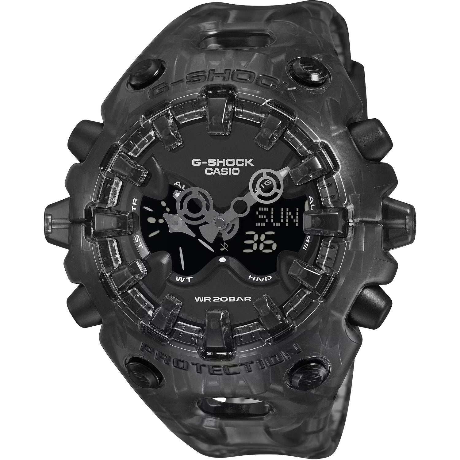 - Semi-transparent skeleton case and band