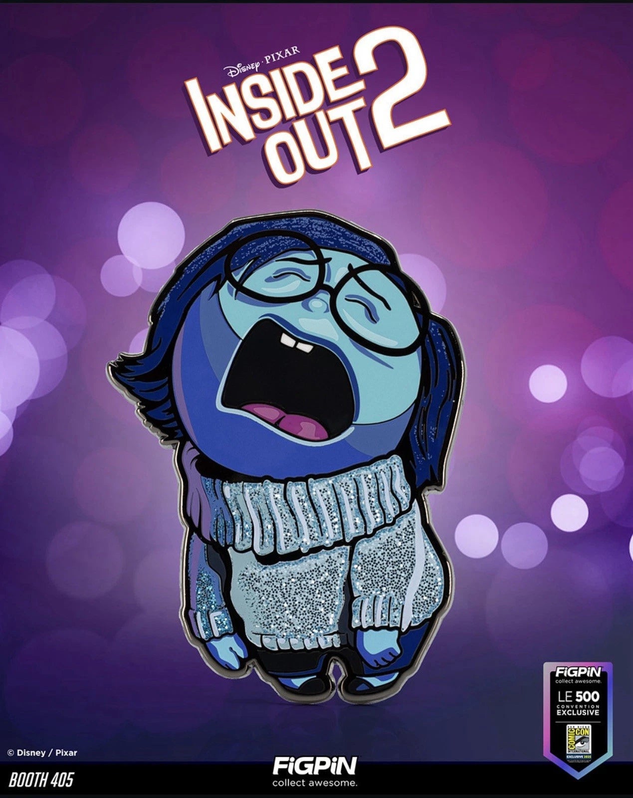 From Disney and Pixar’s Inside Out 2, Sadness makes her shimmering debut as one of the FiGPiN Exclusives available at Booth 405 during San Diego Comic Con weekend.