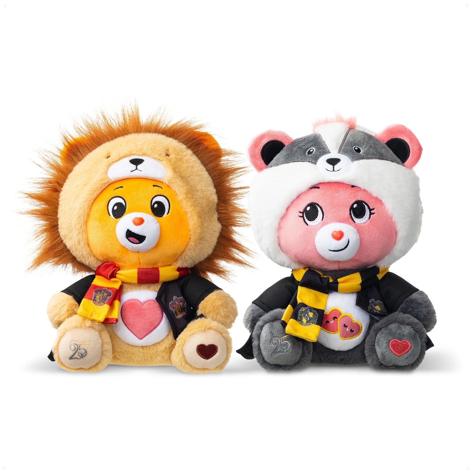 - Delightful Details: Gryffindor House Tenderheart Bear plush has his red heart belly badge, House robe, House scarf with Crest, and a lion mascot hoodie! Hufflepuff House Love-a-Lot Bear plush has her smiling dual hearts belly badge, iconic striped scarf with house emblem black robe, and a badger mascot hoodie! Each bear features the Harry Potter 25th Anniversary logo on their paw.