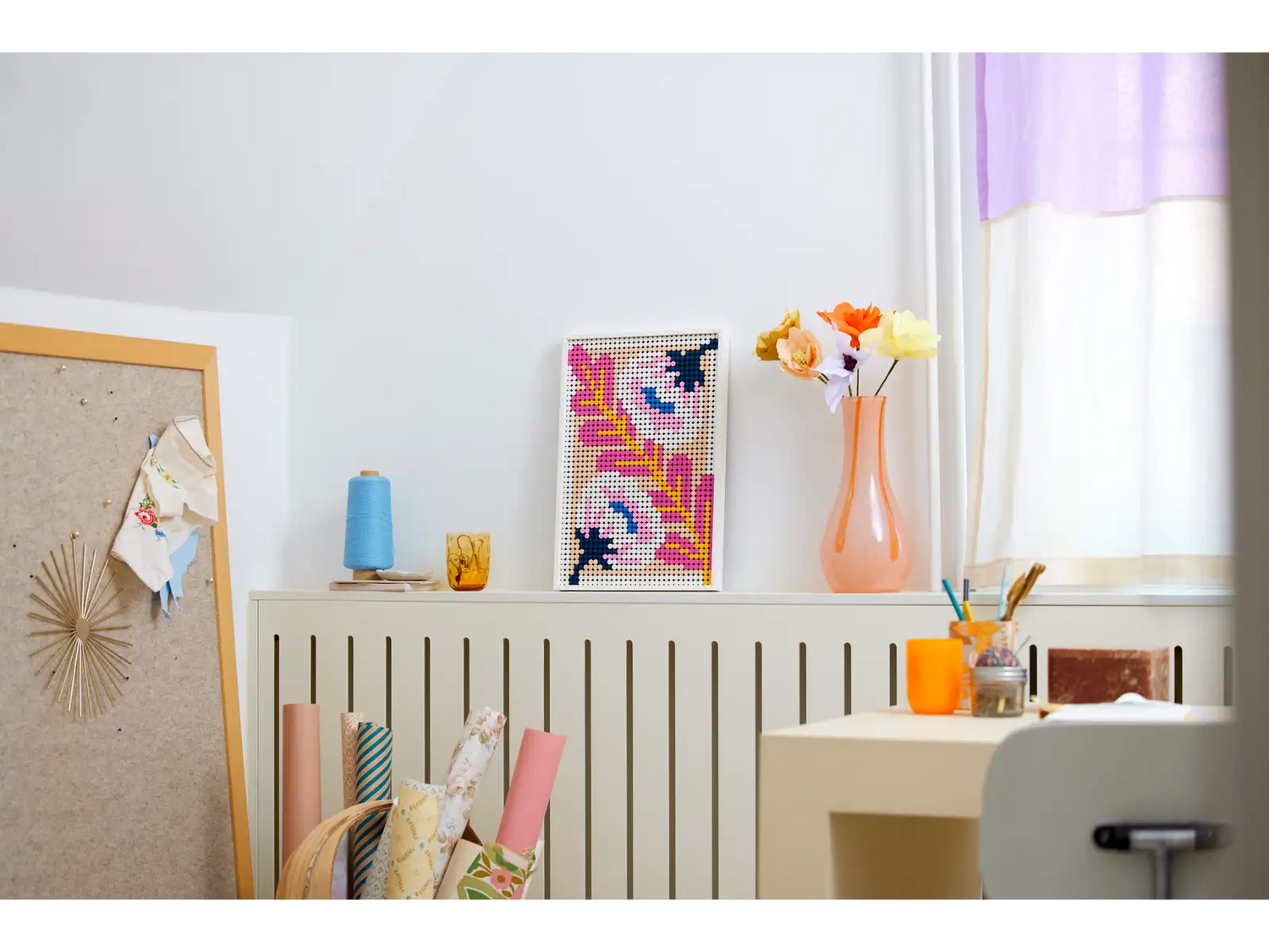 1 picture, 3 choices, many artistic possibilities. Open the box and discover the creative options inside. Choose the flowers and color variants, then design, create and show them off. Finish the art with a brick-built frame in white, then display it with pride on a wall or shelf.