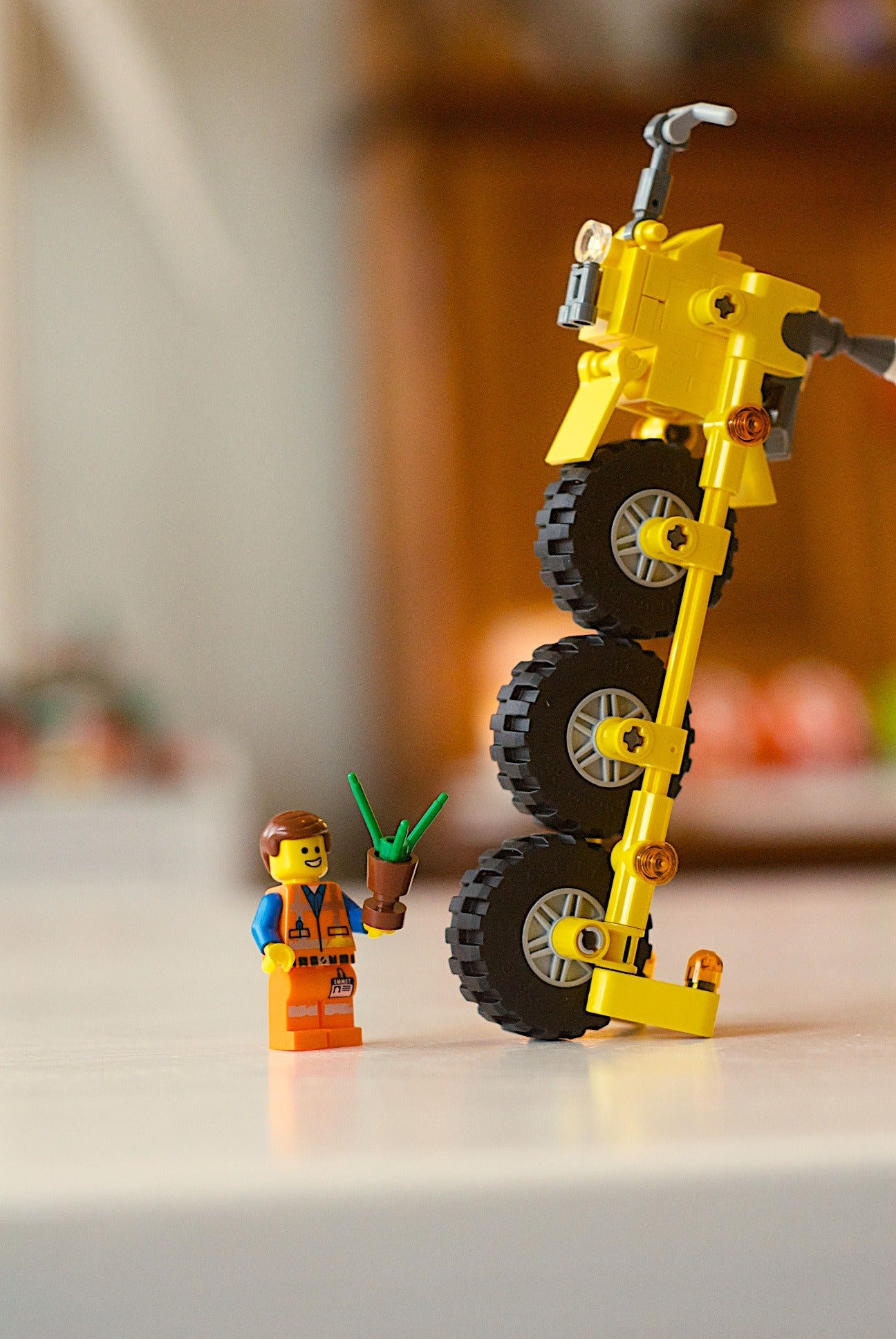 - Emmet’s Thricycle features a minifigure seat, 3 rubber tires, foldout stabilizers and Emmet’s best friend Planty (brick-built).